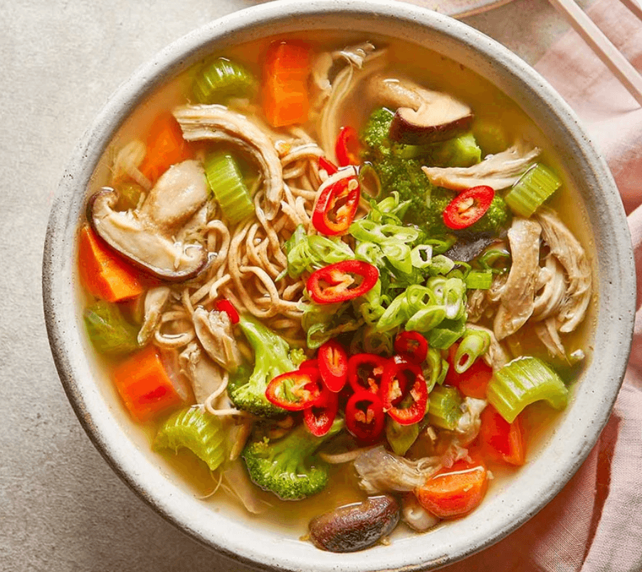 Boost your immune system with this chicken noodle soup made with miso and packed with veg. For a Veggie/ Vegan option serve with tofu or your preferred meat alternative, then top with sliced spring onions and red chilli, if you like a little spice!